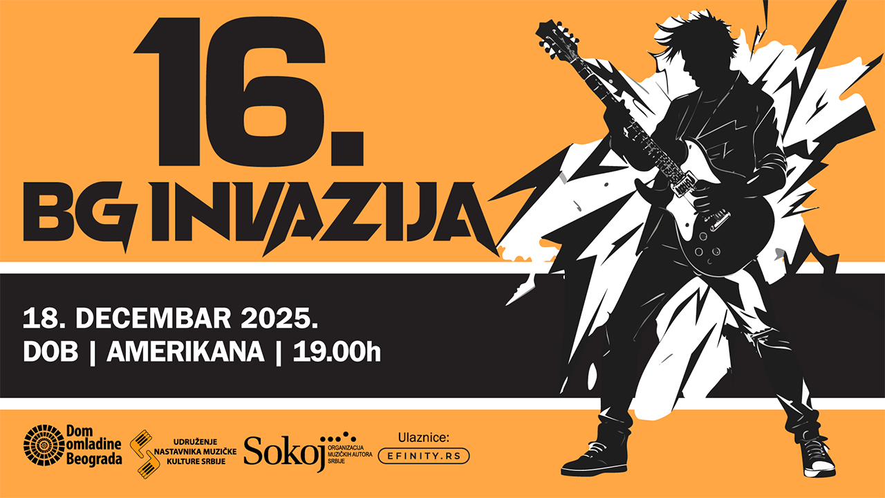 BG Invazija se vraća — jača nego ikad! Pozivamo vas na 16. po redu takmičenje bendova beogradskih gimnazija, koje će se održati u sali Amerikana Doma omladine Beograda, 18. decembra, sa početkom u 19:00. Na sceni vas očekuju neki od najtalentovanijih mladih muzičara iz beogradskih gimnazija, koji će se boriti za titulu najboljeg školskog benda ove godine. Publiku čeka energična svirka, obrade domaćih i stranih kao i autorske pesme, fantastična atmosfera i pravo lice beogradske omladinske muzičke scene.