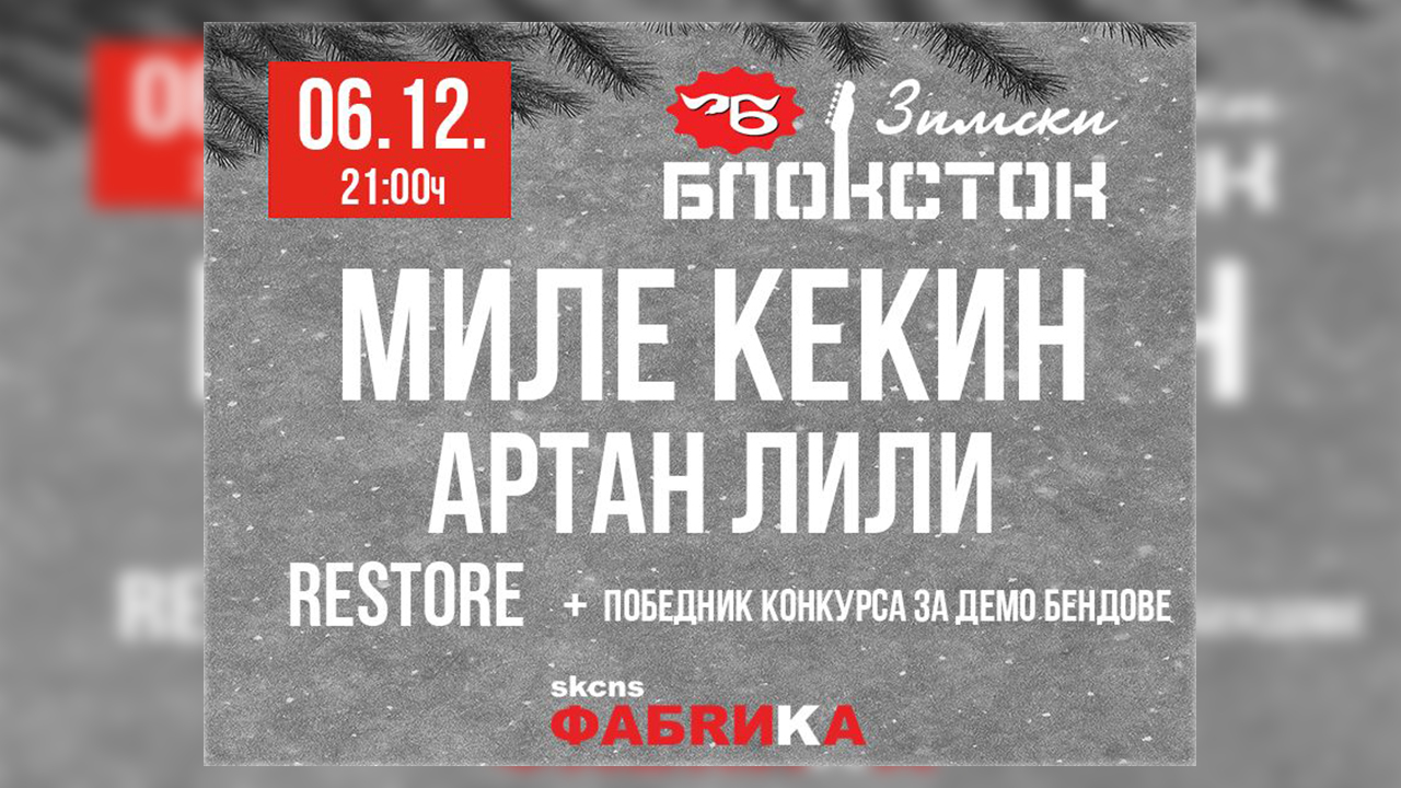 Zimsko izdanje jednog od najstarijih novosadskih festivala, ove godine, na scenu SKC Fabrike dovodi čak četiri sjajna izvođača! Zimski Blokstok od 2018. godine neizostavni je deo kulturne mape Novog Sada, a 6. decembra, na sceni će ukrstiti legende i nove talase rokenrola, pa ćemo u jednoj večeri slušati Mileta Kekina, Artan Lili, mladi zrenjaninski bend Restore ali i pobednika ovogodišnjeg Blokstok konkursa za demo bendove.
