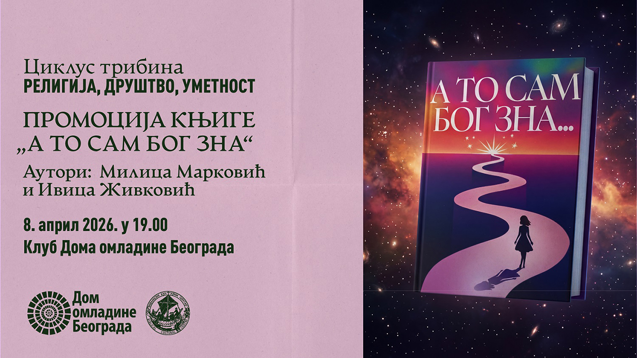 U okviru ciklusa tribina “Religija, društvo, umetnost”, koji Dom omladine Beograda organizuje u saradnji sa Biblijskim kulturnim centrom, u sredu, 8. aprila 2026. biće predstavljena knjiga “A to samo Bog zna”, Milice Marković i dr Ivice Živkovića. Promocija se održava u Klubu DOB, s početkom u 19 časova, a ulaz je slobodan.